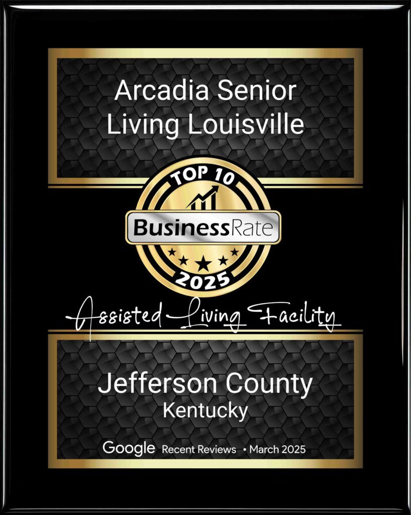 In 2025, Business Rate named Arcadia Senior Living Louisville one of the Top 10 Assisted Living Communities. This honor reflects our amazing team, vibrant residents, and welcoming community—where seniors truly thrive.